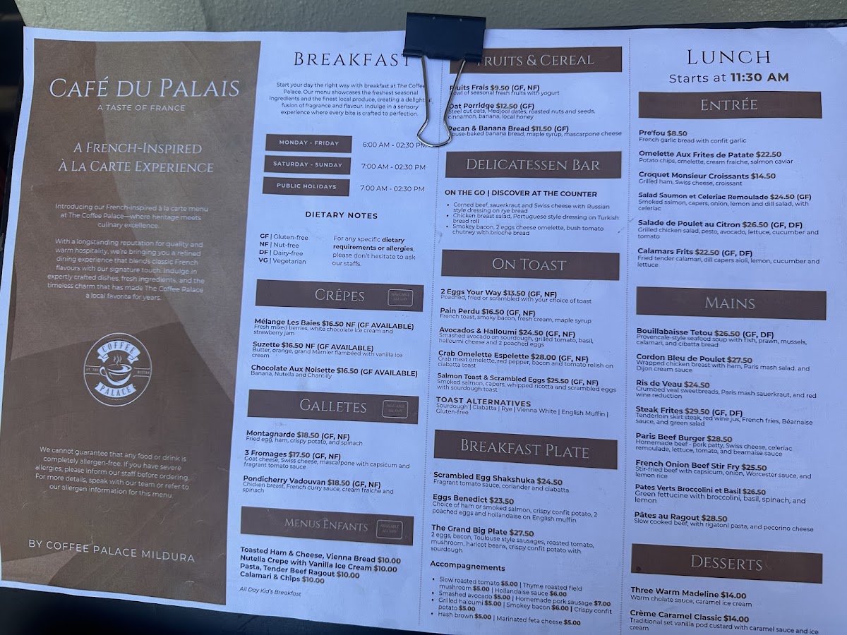 Welcome to Coffee Palace, a charming café nestled at 16 Langtree Ave, Mildura. This inviting establishment offers a delectable menu featuring a variety of delightful dishes for breakfast and lunch. The star attractions include the classic 2 Eggs Your Way, deliciously complemented by your choice of toast, and the indulgent Pain Perdu French toast topped with smoky bacon and maple syrup.